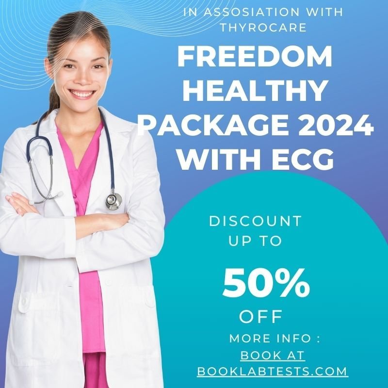 Sale!FREEDOM HEALTHY PACKAGE 2024 WITH ECG includes Ecgn,Basophils – Absolute Count,Eosinophils – Absolute Count,Lymphocytes – Absolute Count + 108 Tests. Home sample collection available. Reports with certified lab quality.