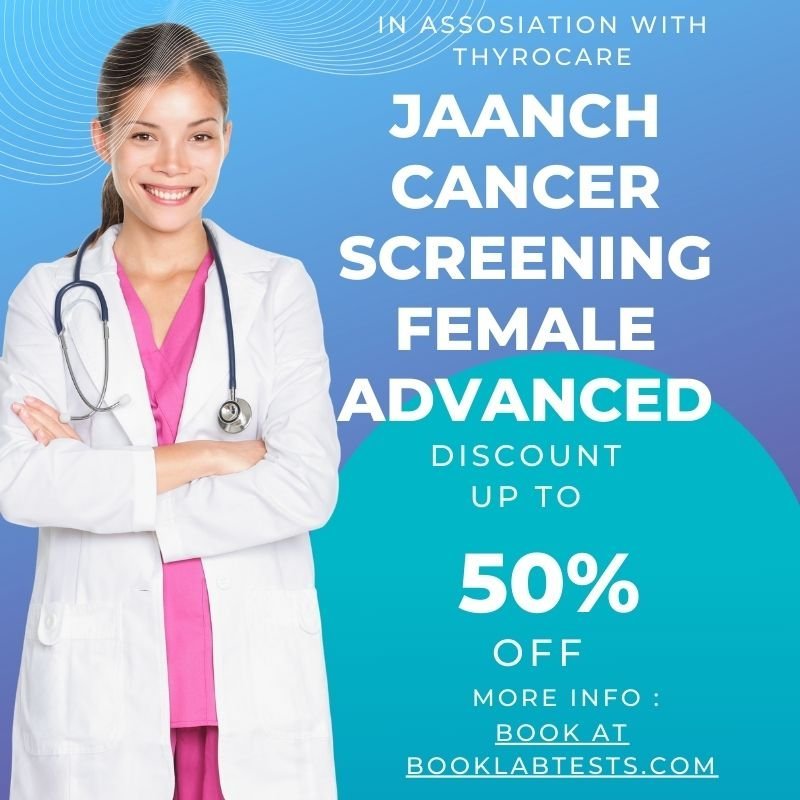 JAANCH CANCER SCREENING FEMALE ADVANCED includes Ca125,Human Epididymis Protein 4,Roma – Premenopausal,Roma – Postmenopausal + 33 Tests. Home sample collection available. Reports with certified lab quality.